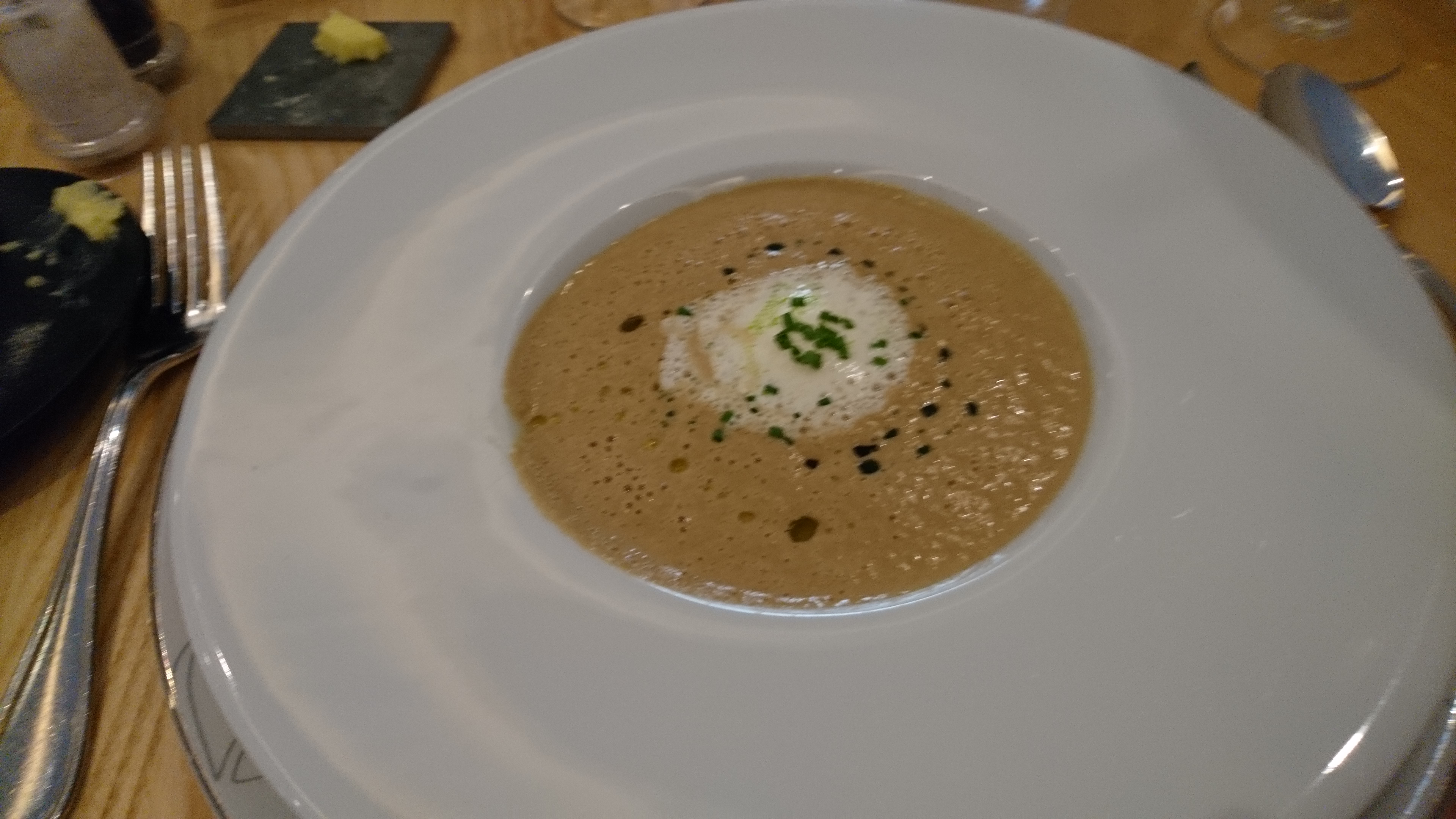 ます、前菜はプルチーニのスープ